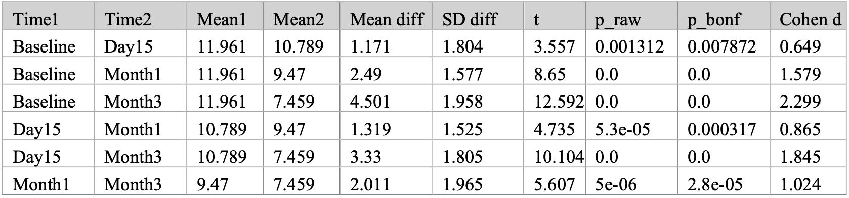 Post-hoc pairwise comparisons (Bonferroni-corrected) indicated significant improvements from baseline to each subsequent interval (p < 0.001).