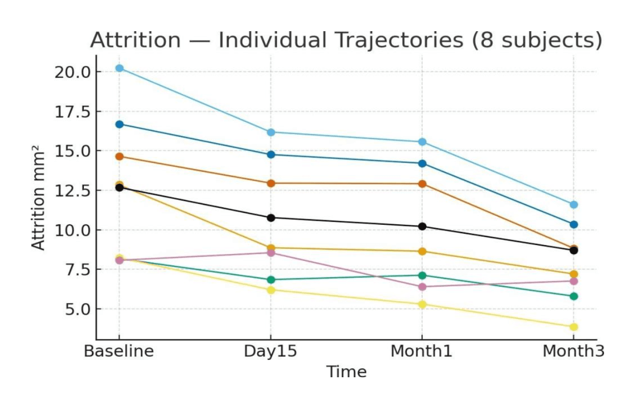 Patients using Hydent Pro formulations demonstrated a substantial decrease in AI-quantified attrition surface area, indicating effective protection and remineralization of enamel surfaces over the 3 -month period.