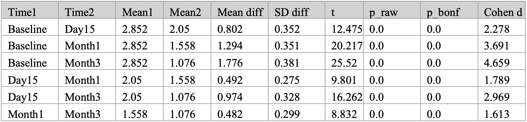 All pairwise timepoint comparisons were statistically significant (p < 0.001 after Bonferroni correction).