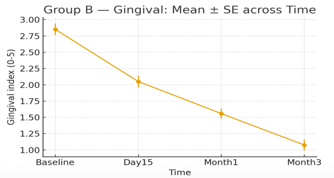 Methods: Sixty participants were enrolled and divided into two groups (n=30 each). Group A received Hydent Pro toothpaste and mouthwash, and Group B received Gumlock toothpaste with Flagyl gel. Attrition surface area (mm²) and gingival inflammation index (0–5 scale) were analyzed using AI Dent X-ray Analysis and ToothFit Oral Scan systems, respectively, at baseline, 15 days, 1 month, and 3 months. Statistical analysis was performed using repeated-measures ANOVA and Bonferroni-corrected paired t-tests.