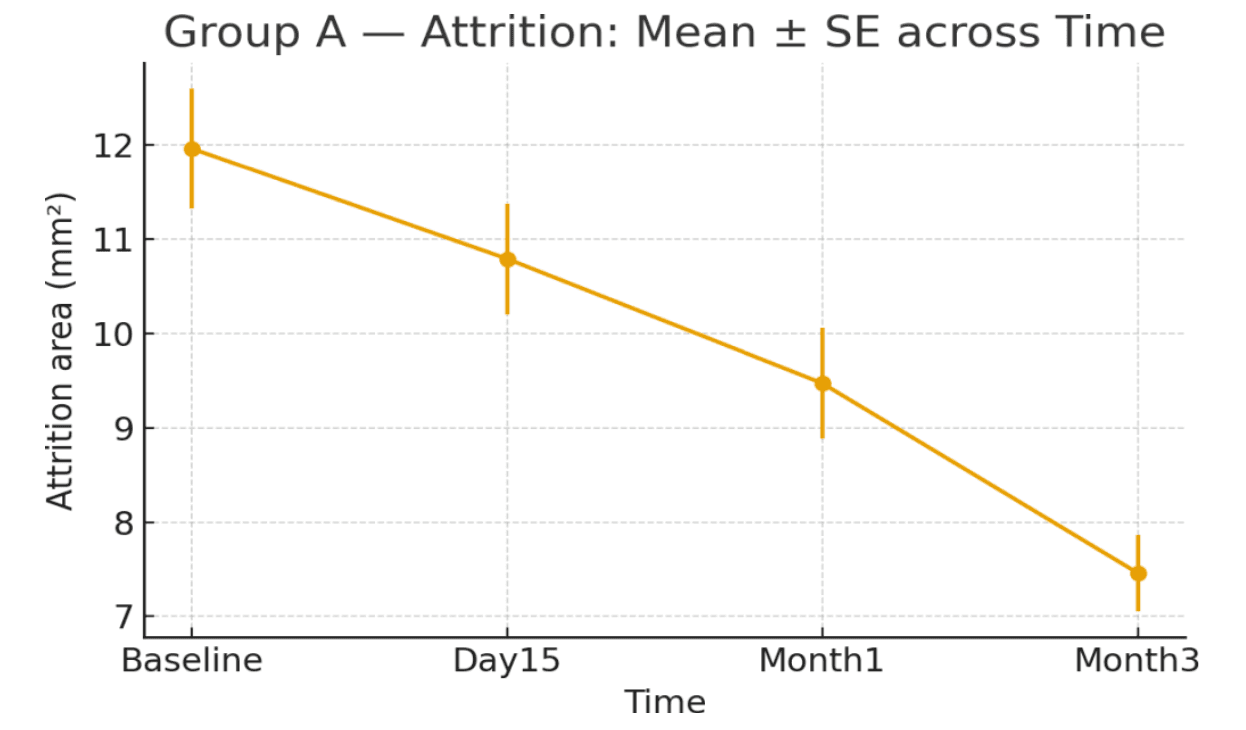 Results: Group A showed significant reduction in attrition area (from 11.96±3.48 to 7.46±2.20 mm², p<0.000001). Group B showed a marked decrease in inflammation index (from 2.85±0.49 to 1.08±0.45, p<1×10⁻¹⁹). Both groups demonstrated very large effect sizes (Cohen’s d>2.5). AI quantification provided high precision and reproducibility.