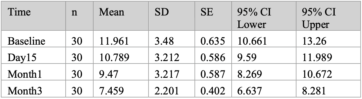 The mean reduction between baseline and 3 months was 1.67 ± 0.37 (p < 0.000001), representing a 59.6 % improvement and an effect size of Cohen’s d = 4.54 (extremely large effect).
